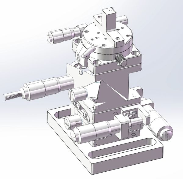 XYZΘXΘYΘZ 六轴可调,XYZ行程:13mm,粗调10um,精调0.5um,ΘX,ΘY,ΘZ:6°;分辨率 0.02°